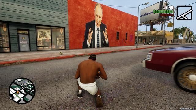 Replace the graffiti on the building in East Los Santos with Vladimir Vladimirovich Putin.