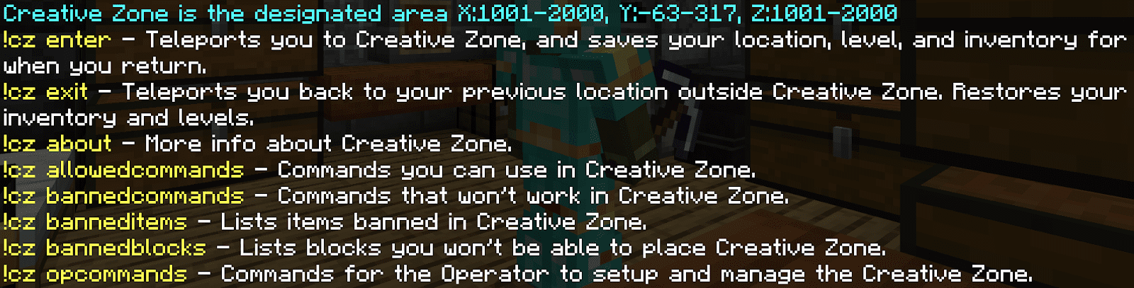 Want to play creatively in a world of survival? Now you can move to a designated area where you can access many vanilla commands. The most pleasant thing is that there is no overflow or contamination in the world of survival! Everything that happens in the creative zone remains in the creative zone. Creative Zone Addon (1.21, 1.20) offers a completely isolated area where anyone can use commands, regardless of permissions. The only way to enter or exit is with '!cz enter' and '!cz exit', which prevents anything from being smuggled out. In addition, the barrier protecting the territory is transparent, so you can demonstrate your buildings to the rest of the world.