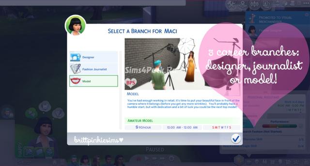 - Three career paths (model, fashion journalist and designer);