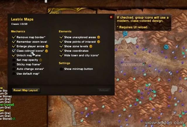 Leatrix Maps changes the standard world map: you can remove borders, add extended dungeon entrance icons, hide city icons, and show raid entrances. You can also adjust the transparency of the card and change the player's markers.