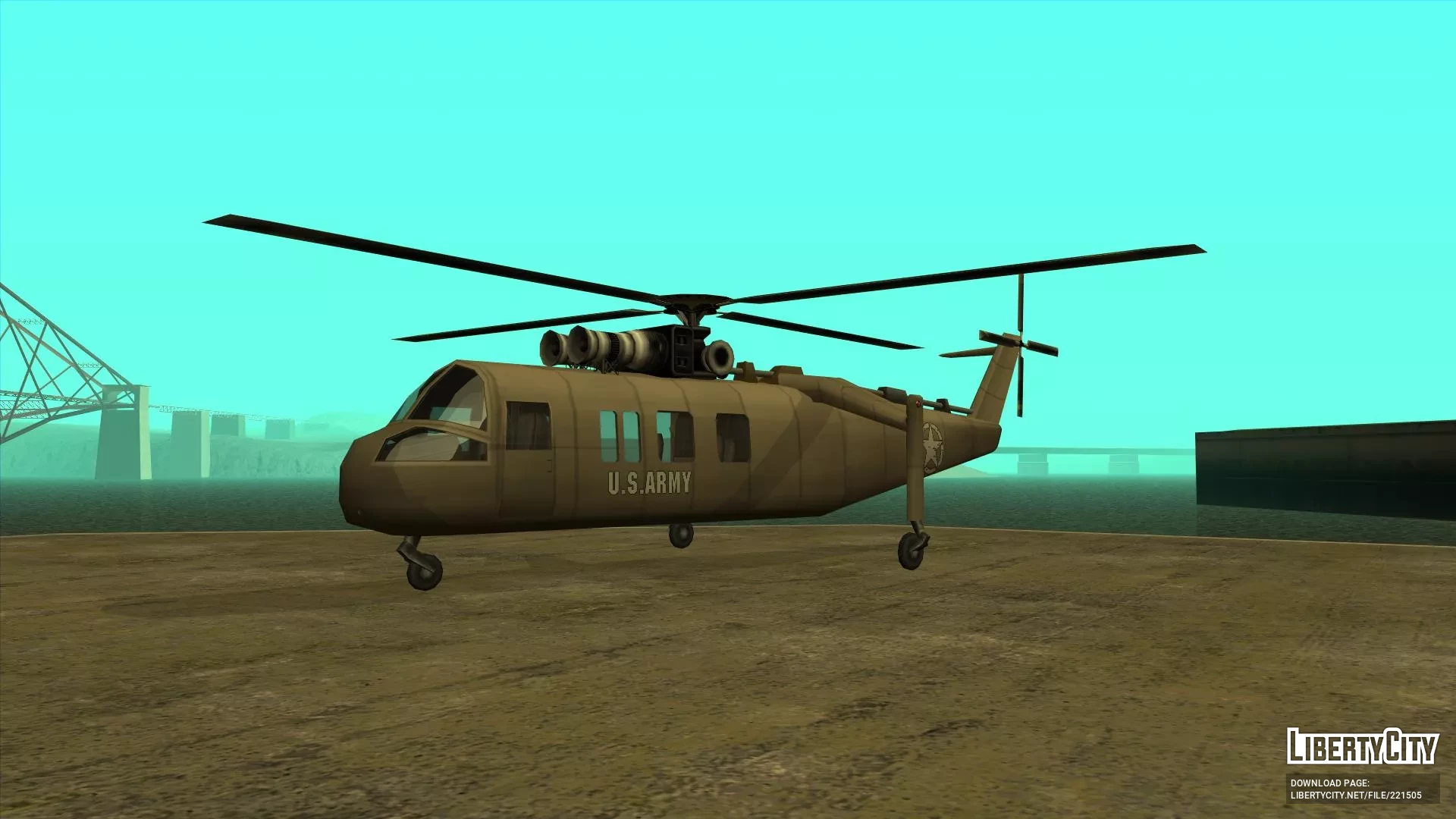 Construido desde cero. Aplica al estilo SA, activos de Rockstar Games, su sombra, LOD y colisión. Tiene un tablero similar al del UH-1 Huey. Una puerta corredera actúa como una parte opcional y se puede abrir o cerrar. Sin embargo, en cualquier caso, puede pisotear un poco en el salón (solo con más cuidado, para no atascarse). El mapa de colisión da la oportunidad de derribar puertas y hacer que el helicóptero se vea cerca del original.